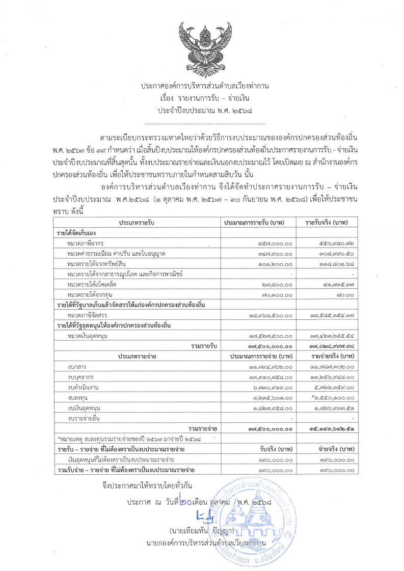 ประชาสัมพันธ์ คำสั่ง/ประกาศ ประกาศองค์การบริหารส่วนตำบลเวียงท่ากาน เรื่อง รายงานการรับ - จ่ายเงิน ประจำปีงบประมาณ พ.ศ. ๒๕๖๘