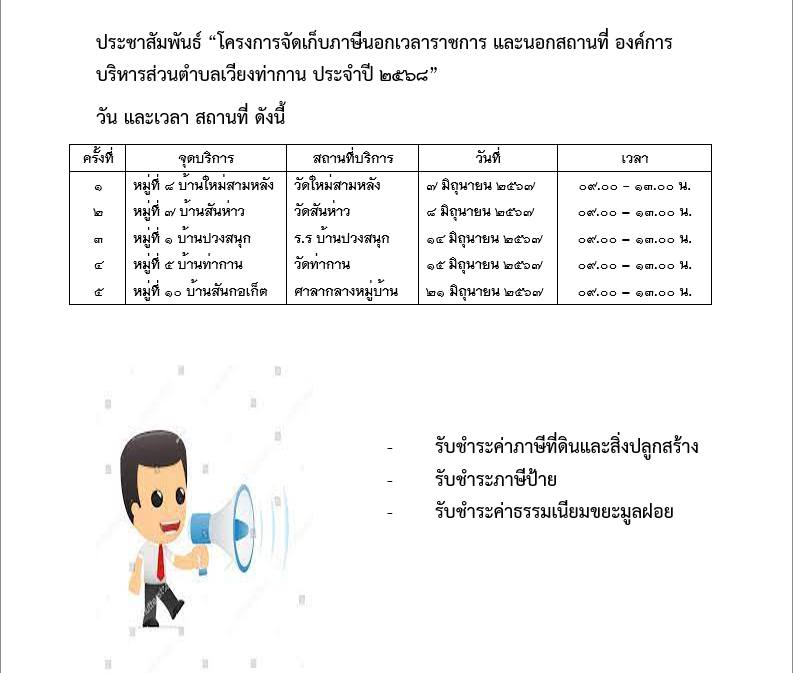 ประชาสัมพันธ์ ประชาสัมพันธ์ ประชาสัมพันธ์ “โครงการจัดเก็บภาษีนอกเวลาราชการ และนอกสถานที่ องค์การบริหารส่วนตำบลเวียงท่ากาน ประจำปี 2568”