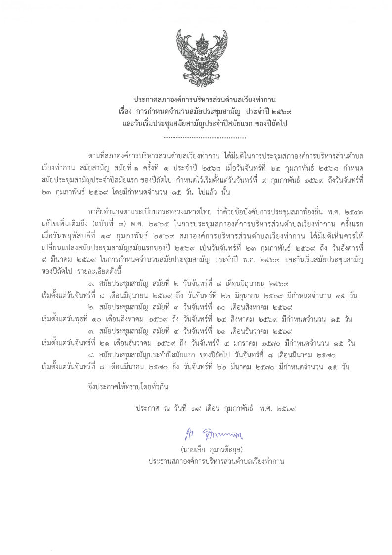 ประชาสัมพันธ์ คำสั่ง/ประกาศ ประกาศสภาองค์การบริหารส่วนตำบลเวียงท่ากาน เรื่อง การกำหนดจำนวนสมัยประชุมสามัญ ประจำปี ๒๕๖๙ และวันเริ่มประชุมสมัยสามัญประจำปีสมัยแรก ของปีถัดไป