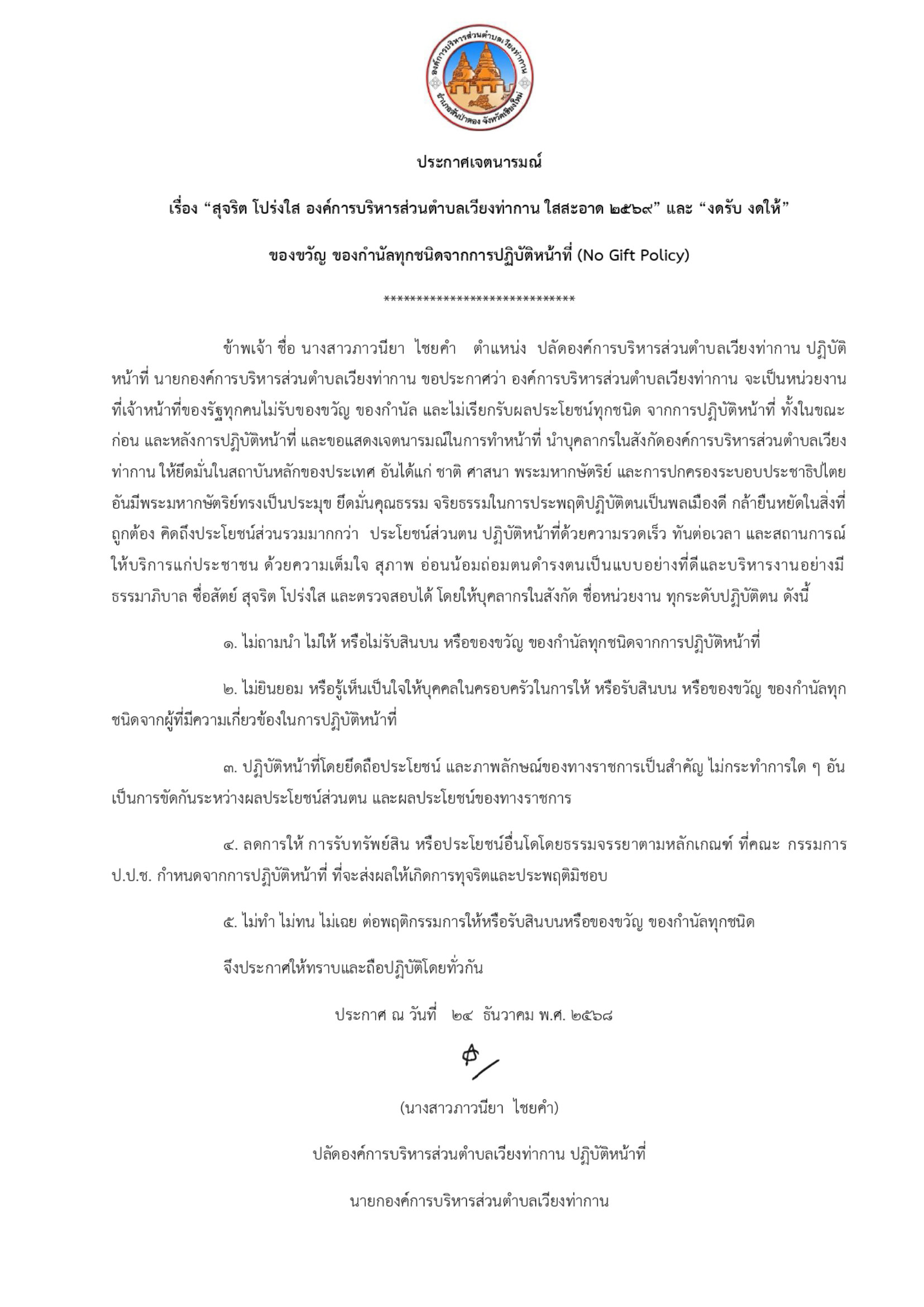 ประกาศเจตนารมณ์นโยบาย No Gift Policy จากการปฏิบัติหน้าที่ ประกาศองค์การบริหารส่วนตําบลเวียงท่ากาน เรื่อง นโยบายการไม่รับของขวัญและของกํานัลทุกชนิดจากการปฏิบัติหน้าที่ (No Gift Policy) ของ องค์การบริหารส่วนตําบลเวียงท่ากาน ประจําปีงบประมาณ พ.ศ. ๒๕๖๙